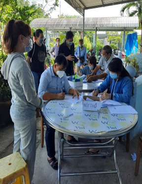 Người dân đến trạm y tế xã khai bao thông tin ban đầu để tiêm vắc xin